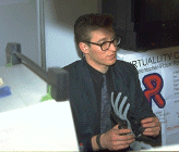 | Der Power Glove ist ein Handschuh, der mittels Elektronik die Lage und Ausrichtung der ihn tragenden Hand erfaßt. | Oben: Guenther Kerndl - Mitglied Nr.13 - mit dem Power Glove. | ||